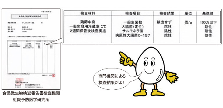 下の報告書は、採取して2~3日した玉子を、適当に選んで、ごく一般家庭にある冷蔵庫で、ごく普通に保存し、2週間してから、専門機関において、検査した結果です。