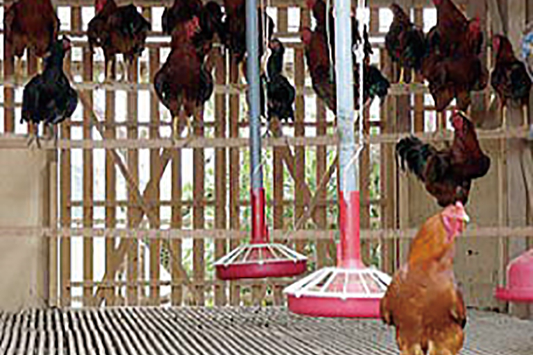 地鶏には、野鳥の本能を色濃く持っているものもあります。そうした地鶏の鶏舎には、止まり木を設けています。